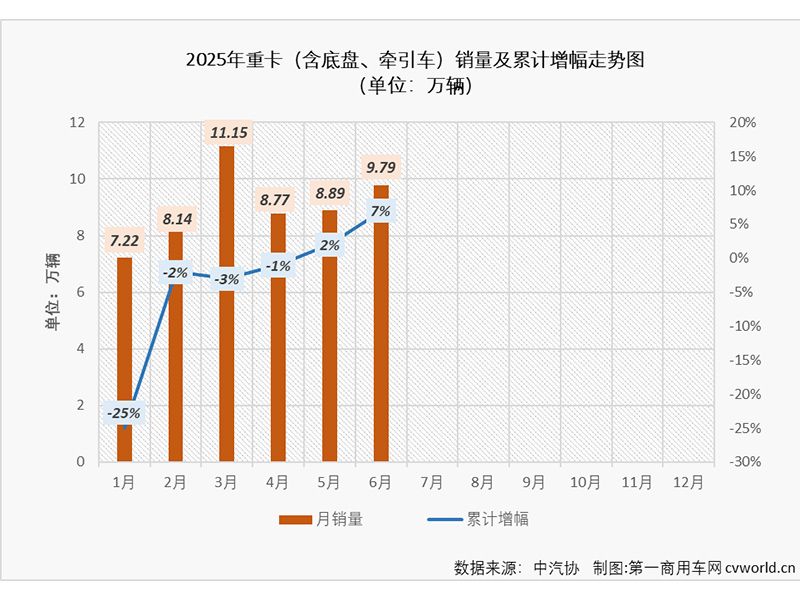 2025年6月份,重卡市場整體銷量接近10萬輛,同比實現37%的增長。此前已連續三個月跑輸重卡市場“大盤”的牽引車市場能否同步實現大增?跑贏還是跑輸?2025年已然過半,牽引車行業格局又有何變化?請看**商用車網的分析報道。6月銷售4.9萬輛,環比增長12%,同比增長31%**商用車網*新獲悉,根據中汽協數據(企業開票數口徑,非終端實銷口徑,下同),2025年6月份,我國重卡市場共計銷售9.79萬輛,環比增長10%,同比增長37%。這其中,作為重卡市場中*受關注的細分領域,牽引車市場在6月份同步實現增長,交出的成績單為:銷售4.89萬輛,環比增長12%,同比增長31%,同比增幅較上月(+0.2%)大幅擴大,但低于重卡市場整體增速,繼續跑輸重卡市場“大盤”。縱觀近五年6月份牽引車市場銷量及增幅走勢圖,*近五年的6月份,牽引車市場走出一個降-降-增-降-增的走勢(與重卡市場整體走勢相同),五年中有三年6月份銷量超過4萬輛,其中2021年6月份銷量達到8.15萬輛,2022年6月份出現超6成大降,跌至不足3萬輛水準;隨后2023年6月份和2024年6月份先后經歷近6成大增和近2成下降,2024年6月份銷量再次不足4萬輛,2025年6月份牽引車市場同比增長31%,4.89萬輛的銷量在近五年里排第二位,比五年*高的2021年6月份少銷售約3.3萬輛,比去年6月份凈增長超1.1萬輛。 從累計銷量看,2025年1-6月,牽引車市場累計銷售27.02輛,在近五年里看同樣是第二高,但其實與前兩年處于同一水平,比去年1-6月的26.58萬輛小幅增長2%,凈增長4000余輛,累計銷量增幅重回上升區間(如上圖)。 重汽超萬輛蟬聯月榜**,徐工/遠程繼續翻倍大漲2025年6月份,牽引車市場同比增長31%,同比增幅較上月大幅擴大(5月份牽引車市場同比增長0.2%)。6月份,牽引車市場繼續僅有1家企業銷量超過萬輛,月銷萬輛企業數與上月持平。重汽銷售1.18萬輛,蟬聯牽引車月榜**。2025年6月份牽引車市場銷量表(單位:輛)從同比增幅看,6月牽引車銷量排行前十企業9增1降,重汽、解放、陜汽、東風、福田、徐工、遠程、北汽重卡、江淮同比分別增長了29%、44%、35%、21%、69%、233%、128%、127%和81%,徐工、遠程等企業已連續多月實現翻倍增長;**下滑的企業6月份銷量同比下降了15%。從同比增幅來看,6月份的牽引車市場仍是有人歡喜有人愁,不過“歡喜”的企業是大多數。 從市場份額看,6月份,牽引車市場銷量前十企業合計份額達到98.80%,其中銷量排名前五企業合計份額就達到88.97%,行業前五企業6月份份額均超過10%,其中排名榜首的重汽月度份額接近25%,達到24.14%;解放、陜汽、東風和福田6月份份額分別為20.14%、18.53%、14.51%和11.64%;排名6-10位的徐工、遠程、北汽重卡、江淮和宇通月度份額在0.6-5%之間。 從行業格局看,2025年6月份牽引車市場行業前十成員與5月份一致,排名出現一些變化:遠程上升一位至月榜第7位(遠程5月份排名月榜第8位);北汽重卡上升一位至月榜第8位(北汽5月份排名月榜第9位);排名月榜前6位的重汽、解放、陜汽、東風、福田和徐工,以及第10位的宇通保持5月份排名不變。1-6月累銷超27萬輛,徐工/遠程領漲,福田份額大增從累計銷量看,今年1-6月,牽引車市場累計銷售27.02萬輛,同比增長2%,累計銷量增幅從5月過后(-3%)轉正,較去年上半年累計多銷售約4400輛。具體到累計銷量前十企業來看,大多數企業都實現增長(8增2降,如上圖)。其中,徐工和遠程累計銷量同比分別大增189%和113%,實現翻倍增長;福田和北汽重卡累計銷量同比分別增長47%和63%,也能算到大增范疇;重汽、陜汽、東風和江淮等企業累計銷量同比分別增長5%、9%、2%和27%。與此同時,累計銷量前十企業中有2家處于下降區間,下滑*嚴重的企業累計銷量同比下降了12%。從累計份額看,牽引車累計銷量前十企業合計份額達到99.04%,排名前兩位的重汽和解放累計份額均超20%,分別達到26.96%和21.64%;排名3、4位的陜汽和福田累計份額分別達到16.96%和12.43%;暫列第5位的東風累計份額也超過10%,達到12.42%,行業TOP5企業合計份額高達90.41%,**優勢巨大;排名6-10位的徐工、遠程、北汽重卡、江淮和宇通累計份額在0.4-4%之間。與去年同期相比,重汽、陜汽、福田、東風、徐工、遠程、北汽重卡和江淮等企業今年1-6月市場份額有所提升,其中福田、徐工和陜汽等3家企業提升*為明顯,分別提升了3.84個百分點、2.28個百分點和1.14個百分點。與2024年年終格局相比,今年上半年,牽引車行業前十成員和座次均發生了變化:去年牽引車排位賽*終名列第12位的宇通,目前暫列行業第10位(但宇通**累銷第11位的企業不足百輛);去年年終排名第10的遠程商用車, 6月過后暫列行業第7;去年年終排名第5位的福田今年6月過后暫列行業第4;去年年終排名第7位的徐工上升一位,暫列行業第6?!澳氵M我退”中也有企業排名出現下滑,甚至被擠出前十。不過2025年的進度條剛過半,落后的企業還有追上來的機會。結語2025年6月份,重卡市場整體銷量同比實現37%的增長,牽引車市場同比增長31%,連續四個月跑輸重卡市場“大盤”;今年上半年,重卡累計銷量同比增長7%,牽引車市場2%的累計增幅同樣跑輸。下半年,牽引車市場何時能跑贏重卡市場大盤?請關注本站后續報道。